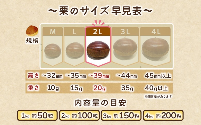 - <奥伊予の栗 2L~4L(約1kg~4kg)> 選べる内容量 サイズ 大玉 大粒 プレミア 大きい 甘い 生栗 和栗 マロン くり 和栗 栗ごはん 栗きんとん 甘露煮 国産 産地直送 城川ファクトリー 愛媛県 西予市【冷蔵】『2025年9月中旬~10月上旬に順次発送予定』
