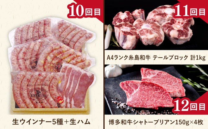 - 【全12回定期便】糸島・贅沢お肉定期便 毎月3~4人前 ( 博多和牛 糸島和牛 糸島豚 はかた地どり イノシシ ウインナー シャトーブリアン ステーキ ハム ソーセージ ハンバーグ ) [AAH009] 地鶏 モモ ハンバーグ ジビエ 肩ロース 焼肉 水炊き お肉 牛肉 豚肉