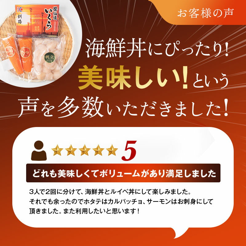 - 【ふるさと納税】北の味覚海鮮3点セット いくら250g サーモン400g ほたて500g 海鮮丼 セット 鮭 シャケ サケ 魚卵 海鮮 海鮮セット 海鮮醤油漬 刺身 福袋 サーモン いくら ホタテ 貝柱 刺身 F5F-0096