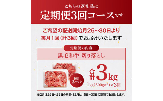 S001-001-T03_04_【定期便3回】A4~A5等級 黒毛和牛 切り落とし1kg(500g×2P)3か月連続お届け【2026年4月発送開始】
