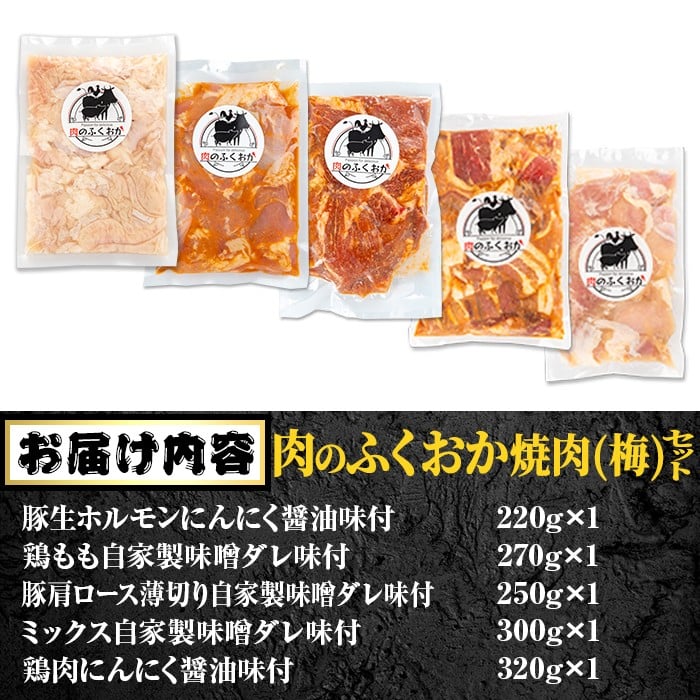 - A79012 肉のふくおか 焼肉セット(梅) (全5種類・計約1.36kg)鹿児島 国産 豚 ホルモン お肉 味付け おかず 冷凍 味付け 味噌 みそ 味噌ダレ たれ漬け 肩ロース 薄切り バーベキュー にんにく からあげ 唐揚げ チキンソテー まぜまぜ【肉のふくおか】