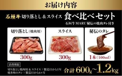- <選べる内容量>【2025年11月以降順次発送】希少な特選石垣牛をご家庭で!!切り落とし焼き肉用とスライスの食べ比べ 合計600g/1.2kg & 石垣牛 MARU秘伝の焼肉タレ100ml×1本 | 沖縄 石垣 特選 牛 切り落とし スライス 食べ比べ 焼き肉 しゃぶしゃぶ すき焼き タレ | IM-32/IM-33