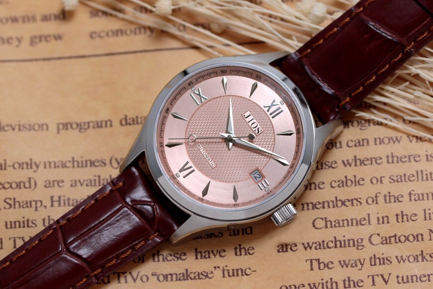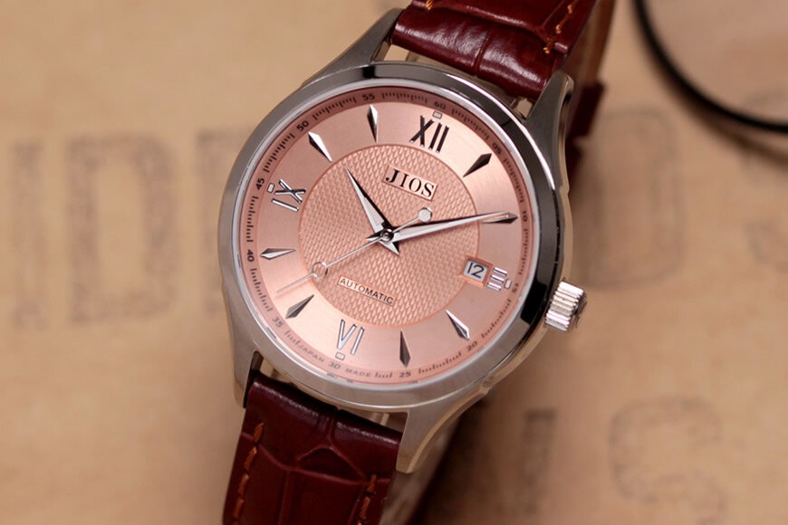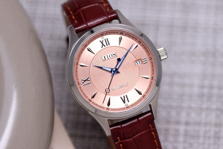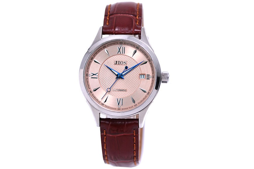 - JIOS SEIRAN 日本製 自動巻き腕時計 メンズ 男性用 革ベルト ブランド ドレスウォッチ ジオス ビワマスサーモン文字盤 ×<シルバー針または青針より選択可>クロコ型押しベルト(ブラウン)