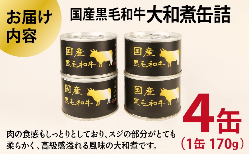 - 010B1813 国産黒毛和牛大和煮缶詰 4缶セット【牛肉 すね肉 おかず おつまみ 防災 備蓄 非常食 防災缶 長期保存】