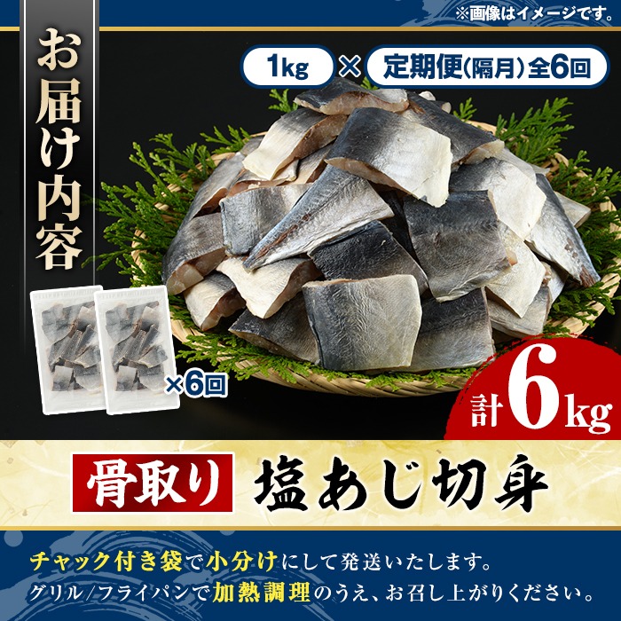 <定期便・全6回(隔月)>骨取り 塩あじ 切身 (計6kg) 大容量 アジ 鯵 骨ぬき 骨抜き 骨なし 海産物 海鮮 おかず 惣菜 焼き魚 お弁当 切り身 ジップロック チャック付き袋 小分け 簡単調理 定期便 【グローバルフーズ】akn061-54