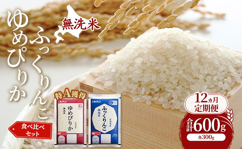 【ふるさと納税】12ヵ月 定期便 米 北海道 無洗米 ゆめぴりか ふっくりんこ 食べ比べ 各 300g 合計 600g (ホクレン米) 特A 獲得 白米 お取り寄せ ごはん 道産米 ブランド米 600グラム お米 ご飯 米 北海道米 送料無料 北海道 芦別市
