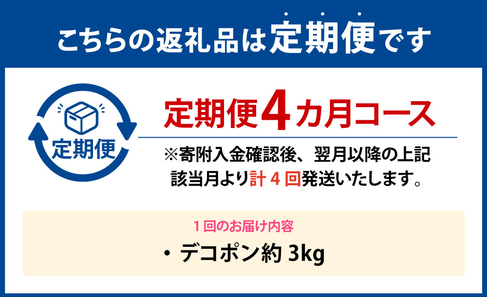 - 【ふるさと納税】【年4回定期便】デコポン 1回あたり約3kg(8~12玉入り) 計約12kg(約3kg×4回) でこぽん 柑橘 かんきつ 食物繊維 フルーツ くだもの 果物 果実 デザート 熊本県産 国産 九州 熊本県 送料無料 【2026年12月上旬発送開始】