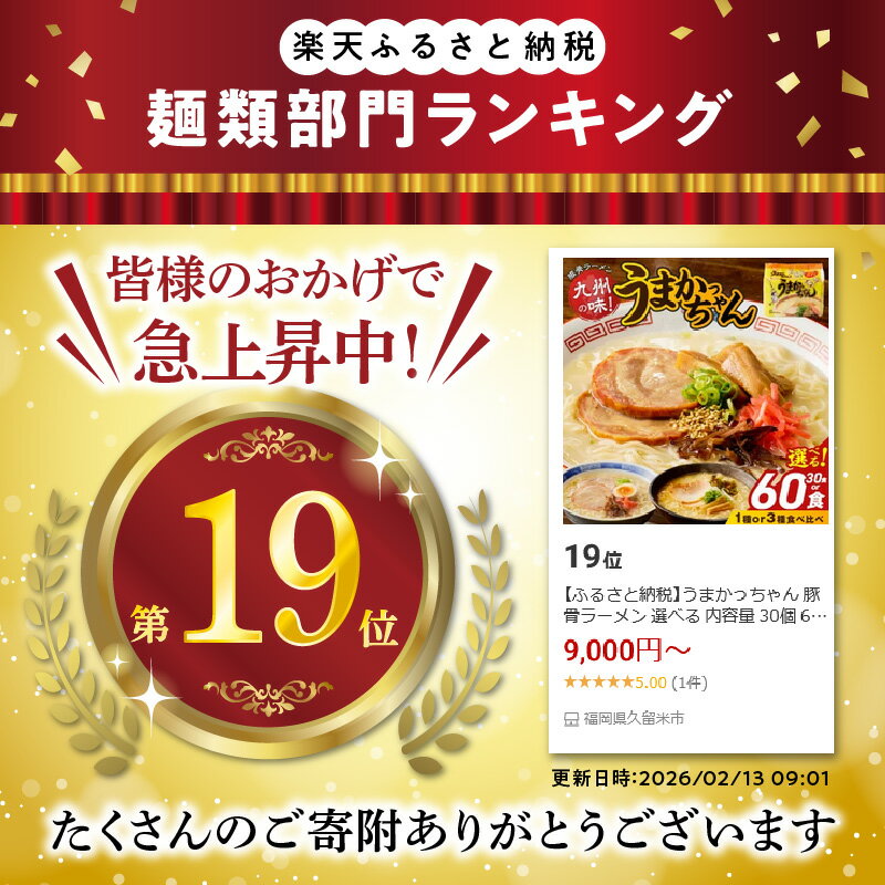 【ふるさと納税】うまかっちゃん 豚骨ラーメン 選べる 内容量 30個 60個 食べ比べ セット 九州 豚骨エキス 野菜エキス 白濁スープ 濃厚新味 高菜風味 ラーメン ご当地ラーメン 即席ラーメン 麺 袋麺 インスタント 食品 グルメ 福岡県 久留米市 お取り寄せ 送料無料