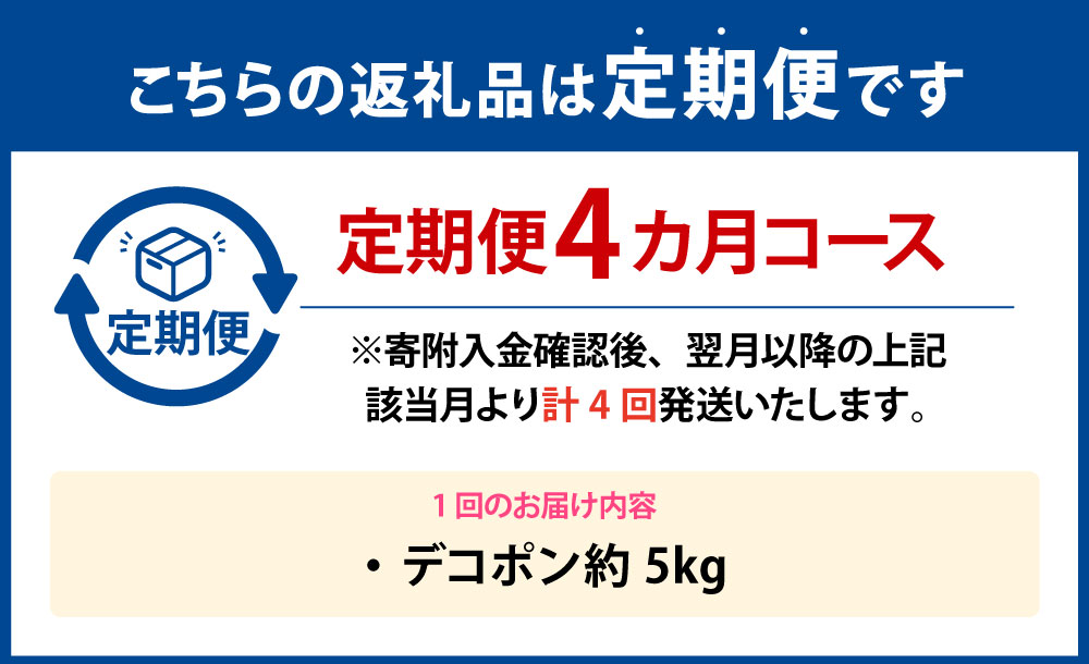 - 【ふるさと納税】【年4回定期便】デコポン 1回あたり約5kg(15~20玉入り) 計約20kg(約5kg×4回) でこぽん 柑橘 かんきつ 食物繊維 フルーツ くだもの 果物 果実 デザート 熊本県産 国産 九州 熊本県 送料無料 【2026年12月上旬発送開始】