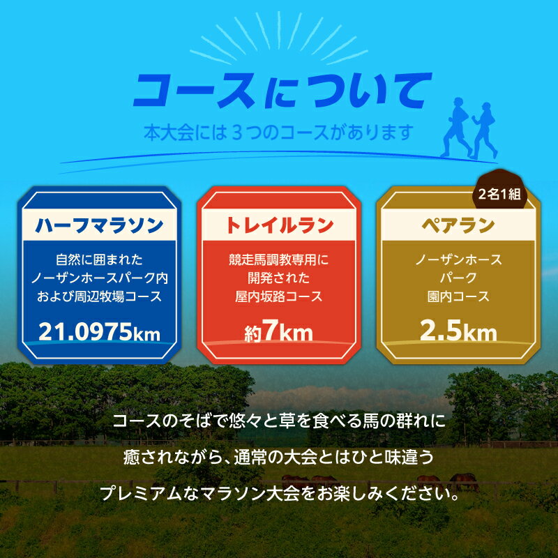 - 【ふるさと納税】 ノーザンホースパークマラソン 出走権利 ハーフマラソン 7kmトレイルラン 2.5kmペアラン マラソン マラソン大会 競走馬 馬 ノーザンホースパークマラソン実行委員会 北海道 苫小牧市 おすすめ ランキング