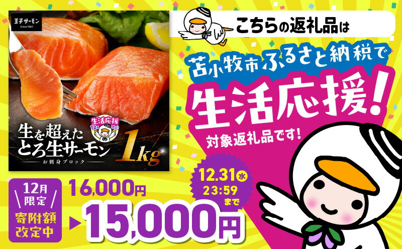 - 【ふるさと納税】 【数量・期間限定 12/31まで 年内 寄附額改定】<選べる容量> 王子サーモン 生を超えた とろ生サーモン お刺身用 ブロック 500g or 1kg サーモン トロ 鮭 刺身 燻製 スモーク 保存料不使用 個包装 北海道 苫小牧市 おすすめ ランキング プレゼント ギフト