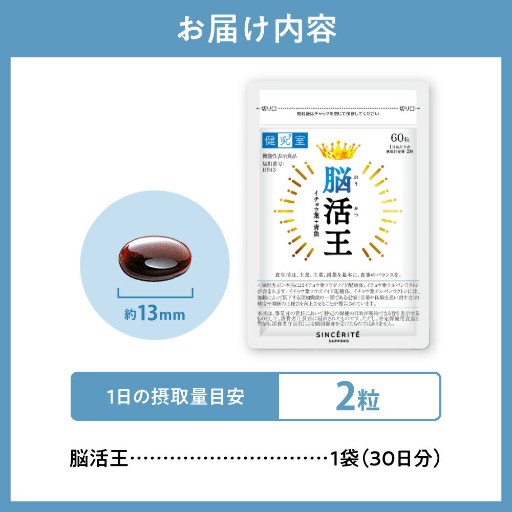 - 【ふるさと納税】 サプリ 脳活王 1袋 30日分 1日2粒 目安 60粒入 イチョウ葉 ラボノイド配糖体 テルペンラクトン 栄養 サポート 機能性表示食品 サプリメント 北海道 札幌市