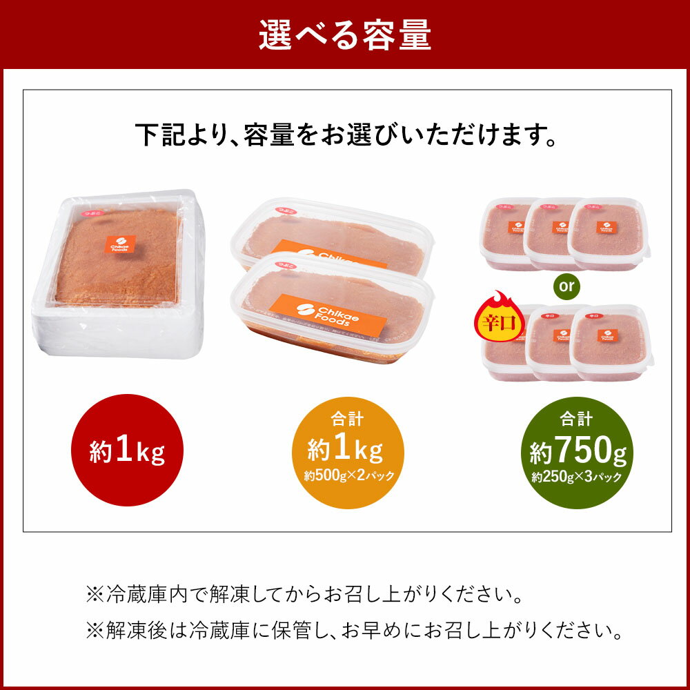 【ふるさと納税】<選べる内容量>辛子明太子つぶこ 1kg / 計1kg(500g×2パック) / 計750g(250g×3パック) / 辛口(計750g(250g×3パック)) からしめんたいこ 魚卵 魚介類 水産物 ごはんのお供 ご飯のお供 トッピング 冷凍 国産 福岡県 直方市 送料無料