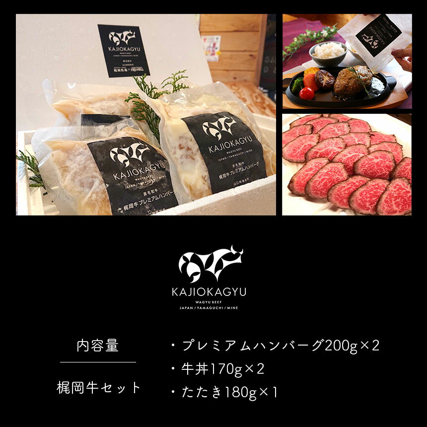 - 【ふるさと納税】 梶岡牛 【 プレミアムハンバーグ ・ 牛丼 ・ たたき 】セット | 黒毛和牛 ブラウンスライス 牛 うし 牛肉 お肉 肉 セット ハンバーグ 牛丼 たたき ハンバーグ お取り寄せ グルメ 冷凍 特産品 山口 美祢 美祢市