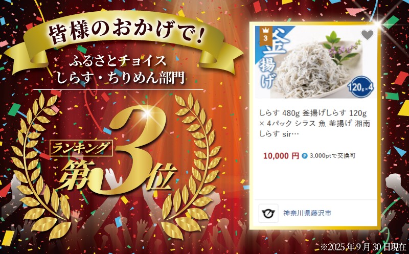 - 釜揚げしらす しらす 計480g 120g × 4 パック シラス 魚 釜揚げ 湘南しらす しらすごはん shirasu sirasu 冷凍しらす 人気シラス じゃこ ちりめん しらす干し イワシ 小分け 便利 手軽 海鮮 新鮮 魚介 魚貝 小魚 冷凍 セット 贈答 江の島 江ノ島 10000円 とびっちょ 神奈川 湘南 藤沢