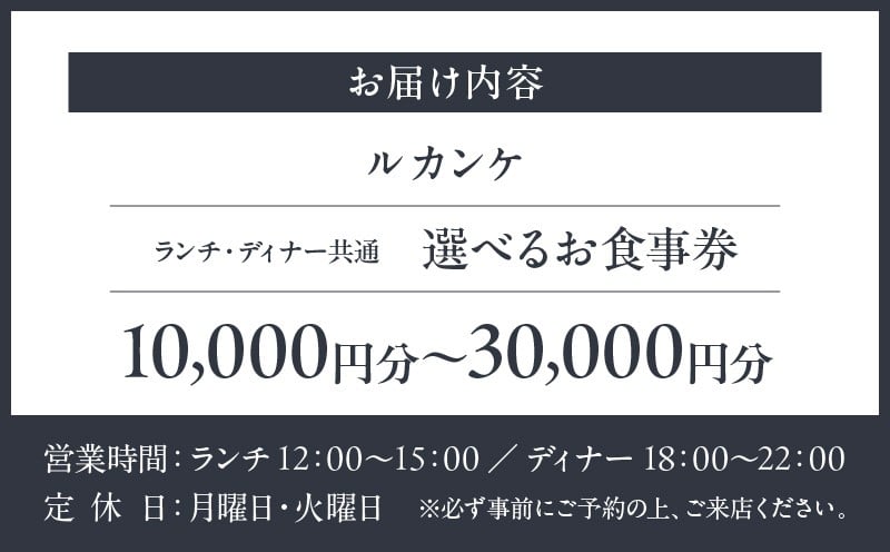 - 【ルカンケ】《ランチ・ディナー共通》10,000円分~30,000円分お食事券(ぐるなびセレクション) │ 東京 白金 食事券 レストラン チケット フレンチ ランチ ディナー 体験