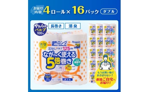- 320ロール相当 トイレットペーパー 5倍巻き ペンギン 超ロング 64ロール (4R×16P) ダブル パルプ (1ロール 125m) 備蓄 防災 長巻き 芯なし 無地 無香料 日用品 富士市 [sf002-547]