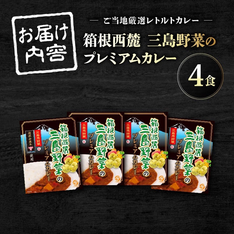 - 厳選素材プレミアムカレー 4食 セット カレー レトルト レトルトカレー ご当地カレー 野菜 じゃがいも 馬鈴薯 人参 タマネギ 玉ねぎ 肉 牛肉 国産牛 惣菜 レトルト食品 防災 災害 災害用品 防災グッズ 備蓄 長期保存 箱根西麓 静岡県 三島市
