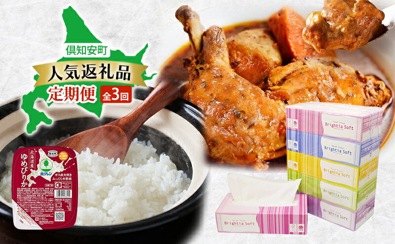 - 【ふるさと納税】倶知安町 人気返礼品 定期便 全3回 ボックスティッシュ 日本製 まとめ買い ティッシュ 防災 常備品 日用雑貨 消耗品 生活必需品 チキンレッグスープカレー スープカレー 野菜 チキン グルメ ゆめぴりか レトルト ごはんパック ご飯 米 北海道