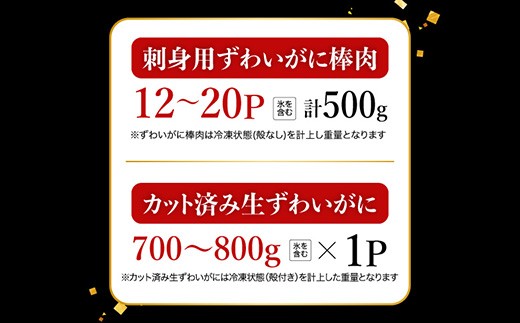 - C-11045 お刺身OK!生ずわいがに棒肉ポーション12~20本(計500g)、生ずわいがに(カット済み)700~800g×1P