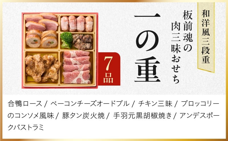 【12月26日受付終了】おせち「板前魂の肉三昧おせち」和洋風 三段重 6.8寸 30品 3人前 ステーキ&豚角煮&ユッケ風ローストビーフ&生ハム 付き【おせち料理 板前魂 贅沢おせち お節 惣菜 冷凍 先行予約 年内発送 おせち料理2026】