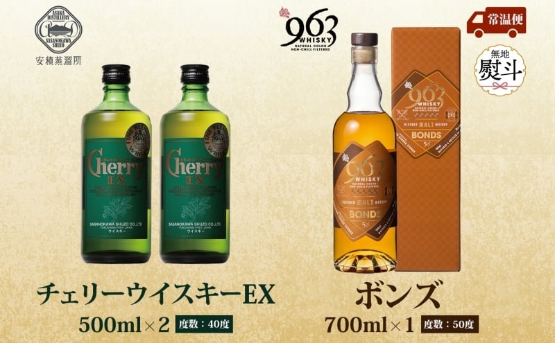 - 無地熨斗 チェリーウィスキーEX40% BONDS963 2種セット ブレンデッド ウイスキー 地ウィスキー 酒 アルコール ハイボール 晩酌 特別 プレゼント 原酒 樽 熟成 BONDS オリジナル ギフト 人気 お取り寄せ ご当地 送料無料 福島県 郡山市