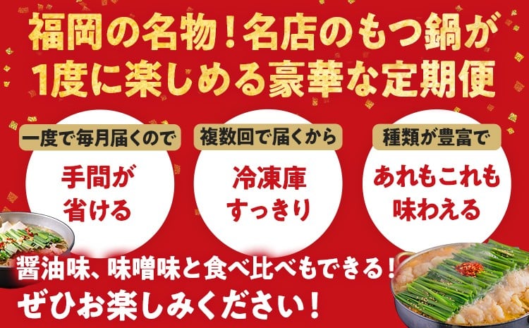 定期便 もつ鍋 グルメ 定期便 約2~3人前 通年 3回 3ヶ月 食べ比べ 楽天地 おおやま 頒布会 醤油 味噌 もつ鍋 国産 牛 小腸 定期発送 冷凍 グルメ 福岡グルメ 牛肉 牛もつ鍋 鍋 鍋セット みそ スープ付き ホルモン もつ 冬 お取り寄せ