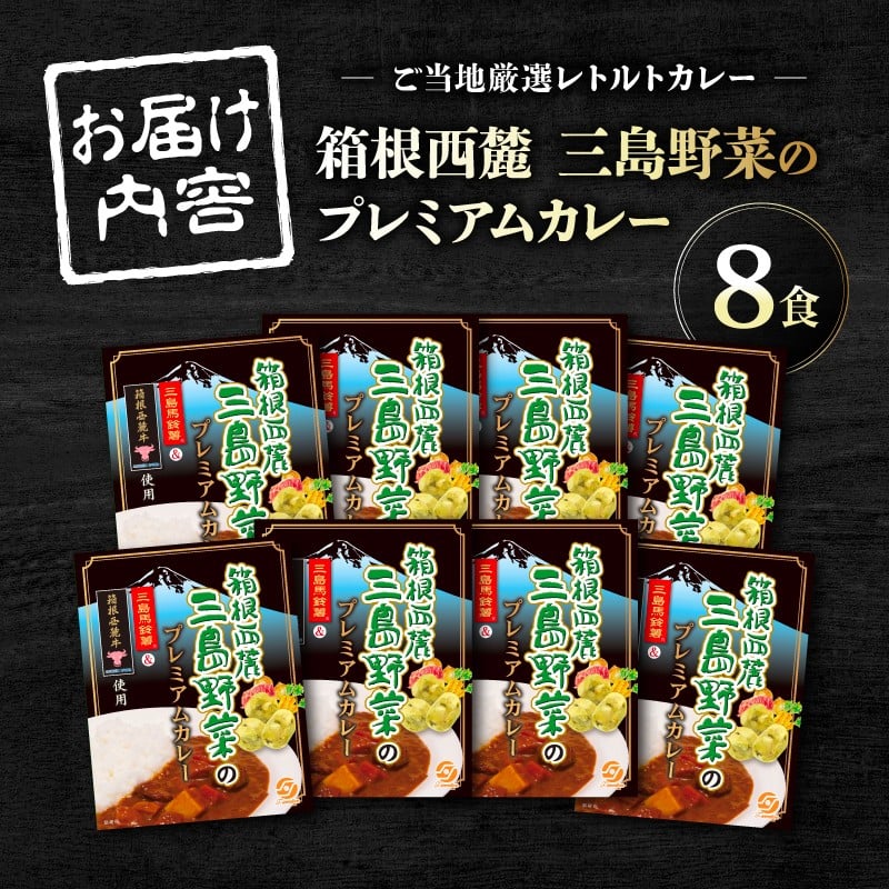 - 厳選素材プレミアムカレー 8食 セット カレー レトルト レトルトカレー ご当地カレー 野菜 じゃがいも 馬鈴薯 人参 タマネギ 玉ねぎ 肉 牛肉 国産牛 惣菜 レトルト食品 防災 災害 災害用品 防災グッズ 備蓄 長期保存 箱根西麓 静岡県 三島市