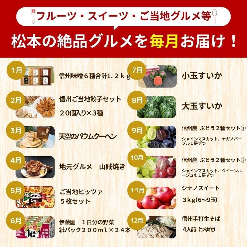 - 長野県 定期便 〈 福袋 〉 松本 味めぐり 満喫セット(定期便 12回)| ふるさと納税 特産品 飲料 松本 名産 味噌 餃子 お菓子 山賊焼き ピザ 飲料 スイカ 小玉 大玉 ぶどう りんご 蕎麦 定期便 沢山 甘い 信州 長野県 松本市 オススメ