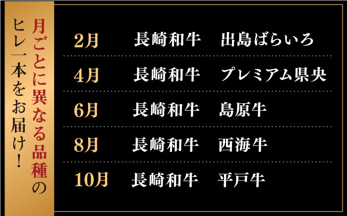 - 【全5回牛肉定期便】長崎和牛ヒレ1本定期便 牛肉 定期便 定期 5回 隔月定期便 ステーキ 焼き肉 ステーキ 焼肉 すてーき 国産 長崎 冷凍 小分けカット 満足 人気 おすすめ お楽しみ 長崎和牛 和牛 冷凍 和牛定期便 牛肉定期便 長崎和牛定期便 肉定期便 国産牛 全5回定期便 国産 黒毛和牛定期便 冷凍 おすすめ【合同会社肉のマルシン】 [QBN055] / 長崎県 佐々町