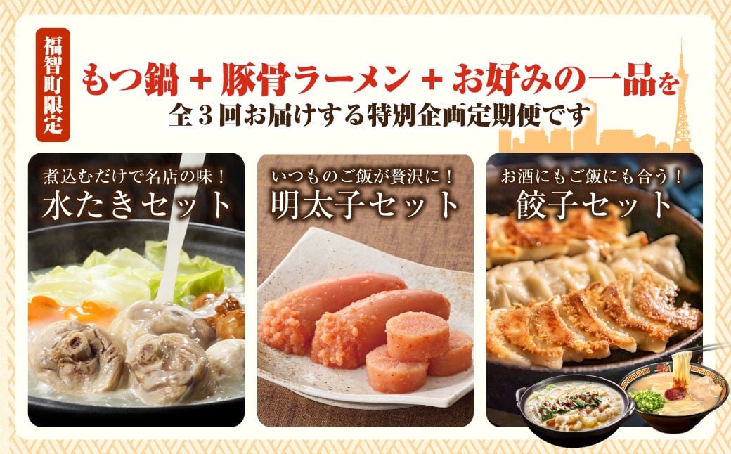 - 自分で選ぶ!福岡グルメ定期便 (毎月・全3回) もつ鍋 水炊き 明太子 豚骨ラーメン 一蘭 地鶏 やまや 餃子 鉄鍋餃子 惣菜 ぐるめ ご当地 名物 福岡 博多 バラエティ 定期便 定期便 福岡県 福智町 送料無料 W99