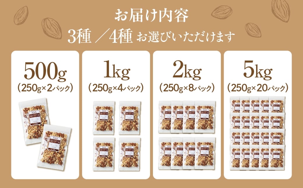 - ≪選べる≫ 素焼きミックスナッツ 3種 4種 【アーモンド・クルミ・カシューナッツ・マカダミアナッツ】500g 1kg 2kg 5kg 250g規格 小分け 定期便 3回 6回 12回 常温 おやつ スナック 無塩 食塩不使用 食用油不使用 ランキング 人気 稲葉商店 ナッツ&ビーンズ 岐阜県 大垣市