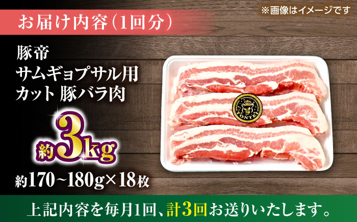 - 【全3回定期便】サムギョプサル 韓国料理 豚帝 バラ肉 カット 約3kg(1枚約170〜180g×18枚)豚肉 焼肉 韓国 パーティ クリスマス 年末 年越し ごちそう 豪華【KRAZY MEAT(小田畜産)】 [ZCP160]