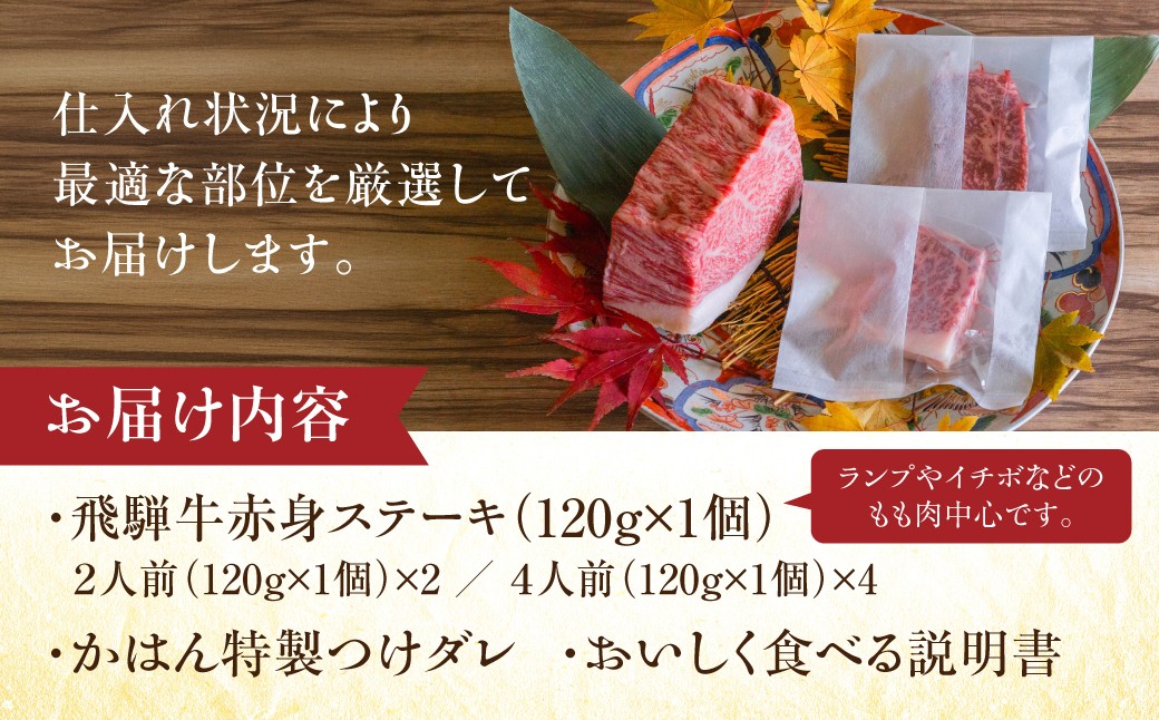 【12/25迄の決済完了で年内発送】特選飛騨牛 極上赤身ステーキ 120g×2人前(お試しサイズ)120g×4人前(がっつりサイズ)ランプ イチボ もも肉 牛肉 ステーキ / 食品 精肉 肉加工品 牛肉 その他 15000円 年内配送 年内お届け 12月