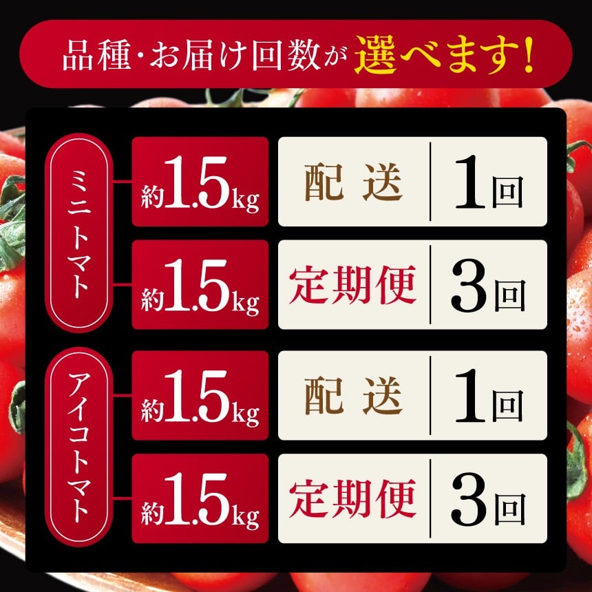 - 選べる 種類 回数 ミニトマト or アイコトマト 1.5kg × 1回 or 3回 生産量 日本一 玉名市 !! | ミニトマト アイコトマト 野菜 トマト プチトマト 定期便3回 生産者直送 産地直送 熊本県 玉名市