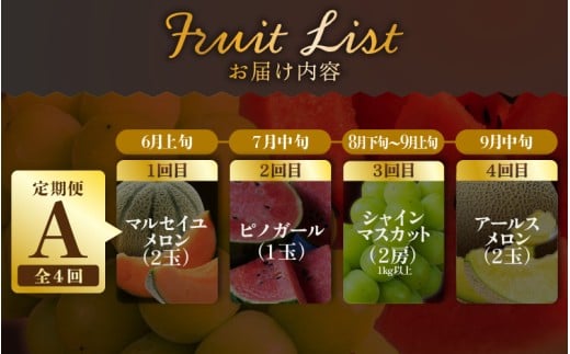 - 【先行予約】【定期便 4回コース】 坂井市フルーツ三昧!!「極」 A 【2026年6月上旬以降順次発送開始予定】【定期便 くだもの 果物 フルーツ お楽しみ スイカ 西瓜 ピノガール マルセイユメロン シャインマスカット ブドウ 葡萄 アールスメロン 贈答 ギフト 贈り物】 [H-3202]