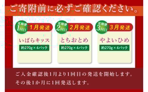【先行予約1月から1回目発送】【茨城県共通返礼品/行方市産】食べ比べいちご・3回定期便「いばらキッス/とちおとめ/やよいひめ」(4パック入×3回) JAなめがたしおさい直送便|甘い 苺 減農薬栽培 (96-04)