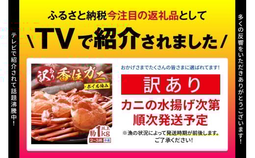 - カニ部門 ランキング1位!〈カンテレ「やすとも・友近のキメツケ!」で紹介!〉【訳あり 香住ガニ 浜茹で 2~3杯 約1kg以上 1~2本指落ち 冷蔵】【令和8年4月以降発送予定】TVで紹介 国産 香住 日本海 カニ かに 蟹 爪 身 脚 しゃぶ ベニ ズワイガニ 紅 べに ずわいがに 訳あり ご自宅用 大人気 おすすめ 兵庫県 香美町 丸近 KMG 19-09-4
