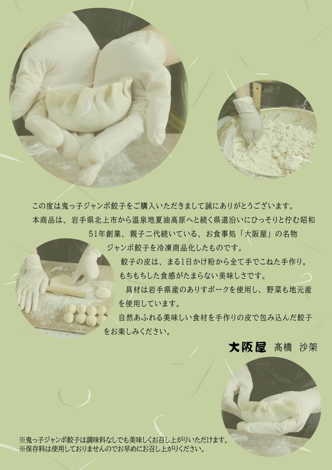 - 大阪屋 鬼っこ ★ジャンボ餃子★ 3個×2P 国産 焼き餃子 冷凍 ぎょうざ ギョーザ 冷凍餃子 簡単調理 惣菜 おかず 中華 ジャンボ餃子 もちもち ありすポーク 豚肉 野菜 手作り餃子 岩手県 北上市 大阪屋 A0302