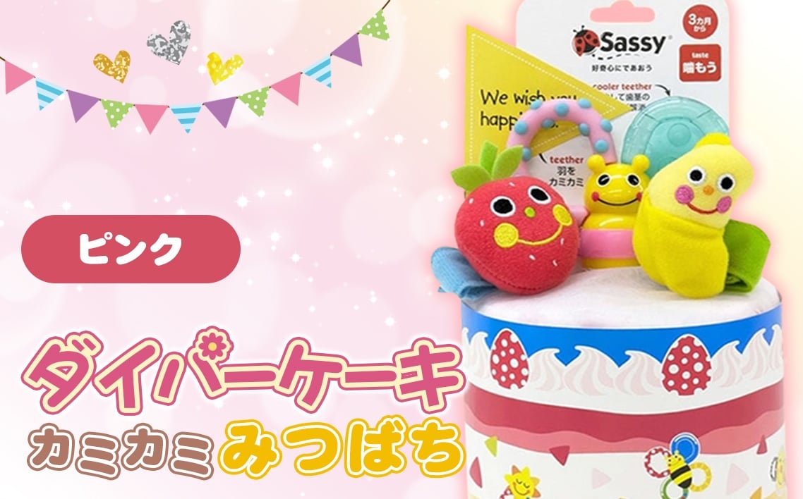 No.345 ダイパーケーキ/カミカミみつばち / おむつケーキ 出産祝 ギフト 贈り物 女の子 男の子 赤ちゃん ベビー ベビーギフト 歯がため ガラガラ おむつ 紙おむつ Sサイズ おもちゃ 千葉県