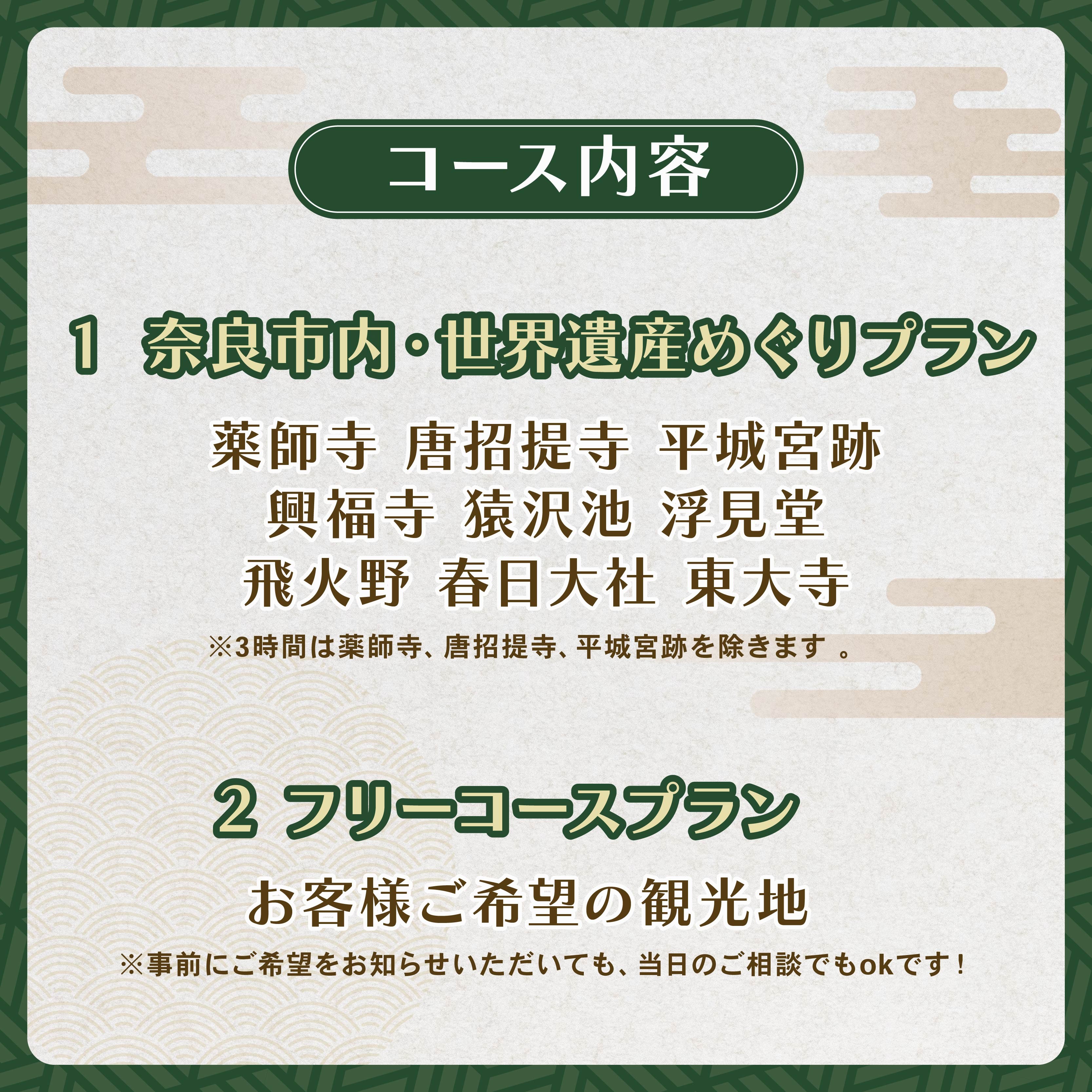 - 【選べる】 貸切観光タクシー 3時間 5時間 奈良市内・世界遺産めぐりプラン フリープラン タクシー 観光 薬師寺 唐招提寺 平城宮跡 興福寺 猿沢池 浮見堂 飛火野 春日大社 東大寺 ドライブ 奈良県 奈良市 なら