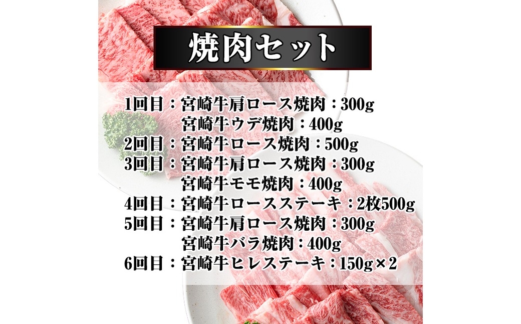 - 【定期便・全6回】宮崎牛定期便<Aセット・焼肉> お楽しみ便 牛肉 国産 定期 ヒレ肉 モモ ウデ ロース バラ 宮崎県産 黒毛和牛 焼肉 ステーキ 【ミヤチク】【R-100】