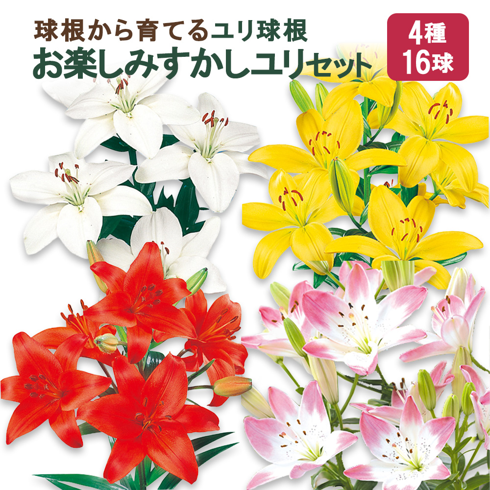 ユリ球根 お楽しみ すかし ユリ セット 4種 16球 送料無料 赤 白 黄 シュガーラブ