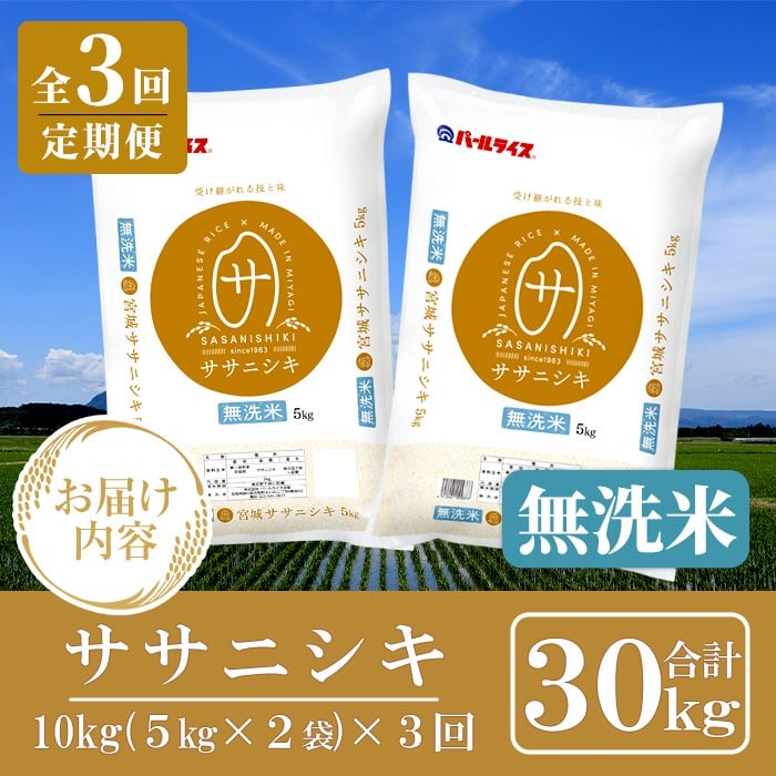 - <3ヶ月定期便>宮城県産 ササニシキ 無洗米 合計30kg (10kg×3回) お米 おこめ 米 コメ 白米 ご飯 ごはん おにぎり お弁当 ささにしき エコ 時短 節水 頒布会【株式会社パールライス宮城】ta599