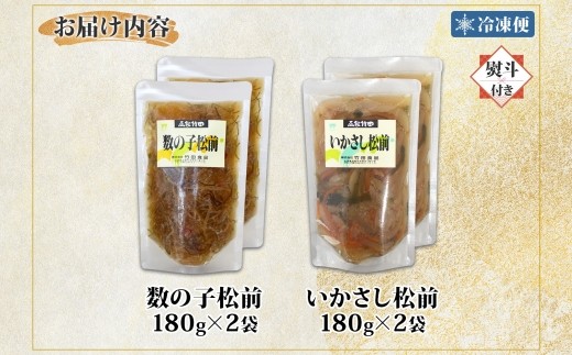無地熨斗 北海道 数の子松前 & いかさし松前 2種 セット 180g 各2袋 手作り 塩辛 松前漬け 海鮮 生鮮 珍味 おつまみお酒 晩酌 お取り寄せ グルメ 冷凍 のし 名入れ不可 函館市 _HD134-062