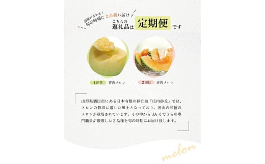 - ≪2回定期便≫ メロン好きに贈る 青・赤彩りメロメロ定期便2026 6月下旬~7月上旬 庄内青肉メロン 約5kg(4~5玉) 7月中旬~7月下旬 庄内赤肉メロン 約5kg(4~5玉) 計2回 山形県酒田産 頒布会 食べ比べ 庄内砂丘 酒田 夏 旬 JAそでうら SD0221