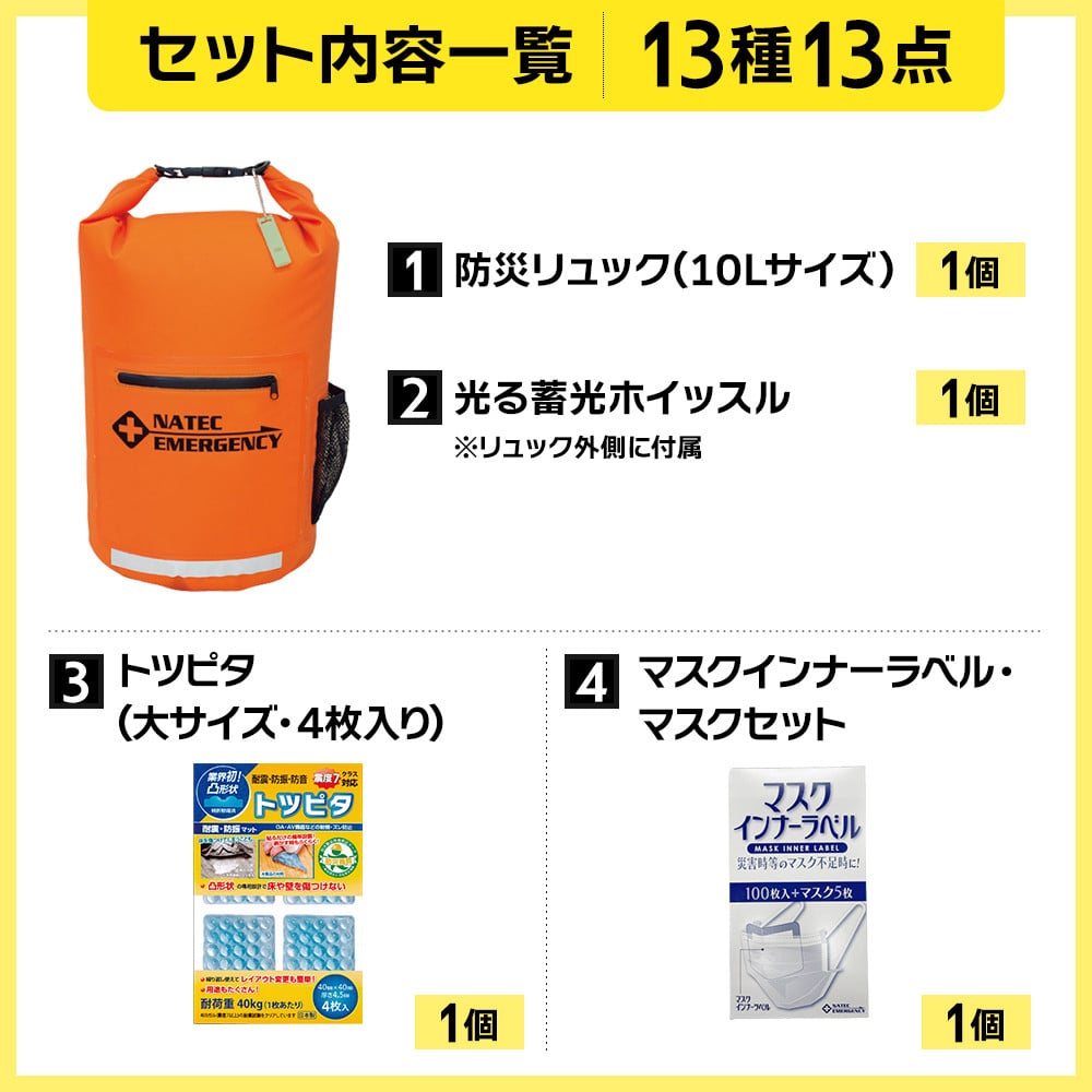 - 防災士監修 防災グッズ 車載用セット 13点 防水 多機能リュック 10L 携帯トイレ 清潔用品 エアマット 保存水 クッキー マスク 非常用持ち出し袋 防災リュック 防災 防災用品 災害 非常用 避難 地震 災害 洪水 震災 ナテック 送料無料 愛知県 あま市