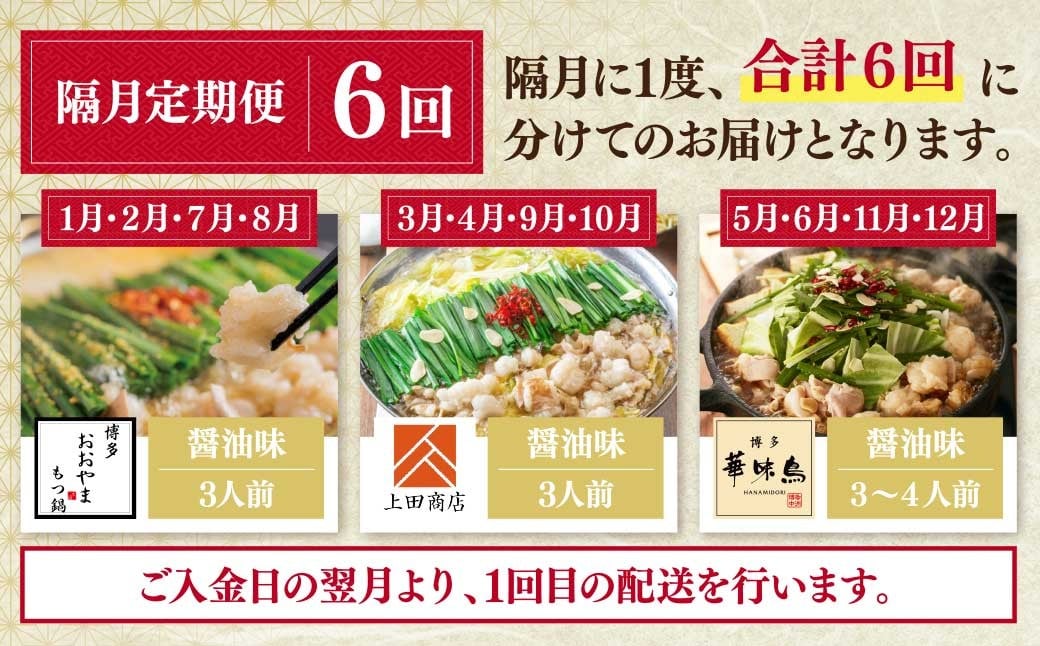 - 選べる!博多名物もつ鍋バラエティ定期便【隔月定期便(年6回 / 3回発送)】 もつ鍋 醤油 しょうゆ おおやま 上田商店 華味鳥 定期便 福岡 人気 国産 福智町 人気 おすすめ W08