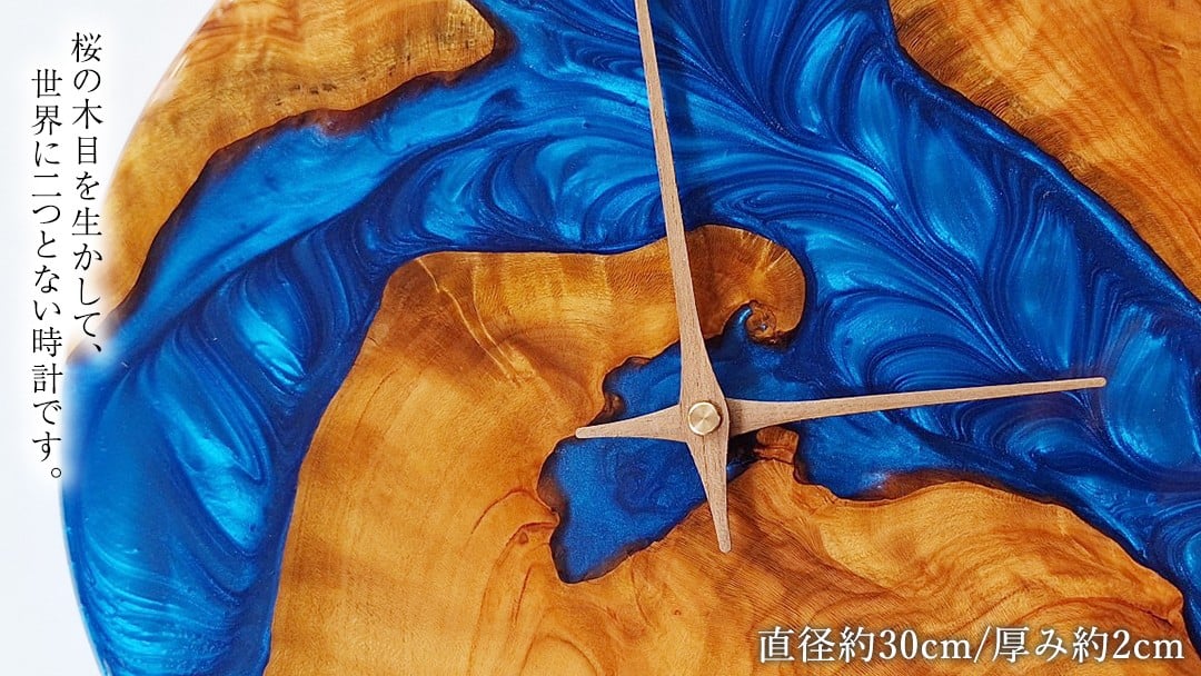 - 桜の木とレジンで作った 壁掛け時計 《ディープブルー》 一年保証付き 大工 建築家 職人 天然木材 手作り 工芸品 民芸品 インテリア 家具 時計 [CM019sa]