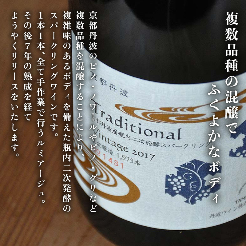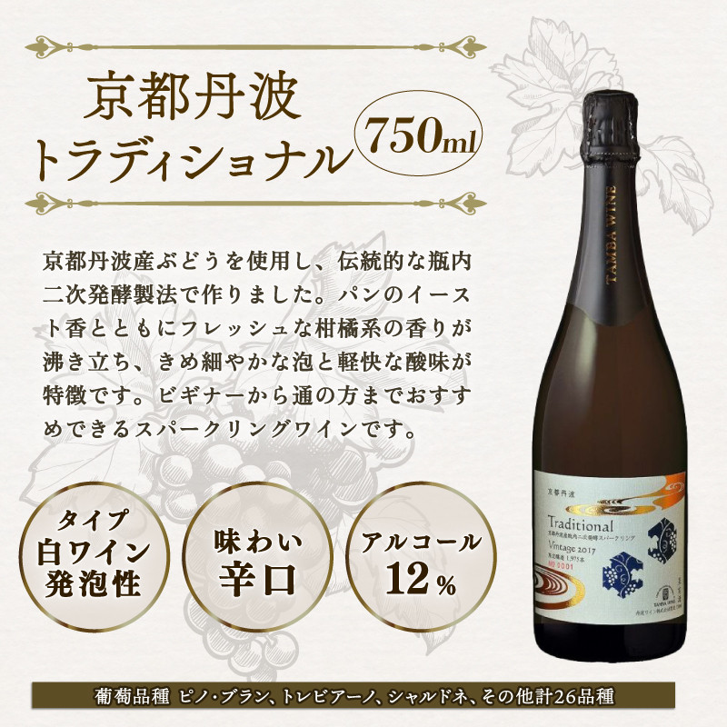 スパークリングワイン 京都丹波トラディショナル 750ml 1本 ワイン スパークリング 白ワイン 辛口 果実酒 果実 国産 葡萄 ぶどう 贅沢 高級 ボトル 瓶 瓶詰め ギフト プレゼント 贈答 贈答品 デザート 人気 ランキング お歳暮 お酒 酒 さけ 瓶内二次発酵 伝統 冷蔵 京都 京都府 京丹波町 丹波 ふるさと納税